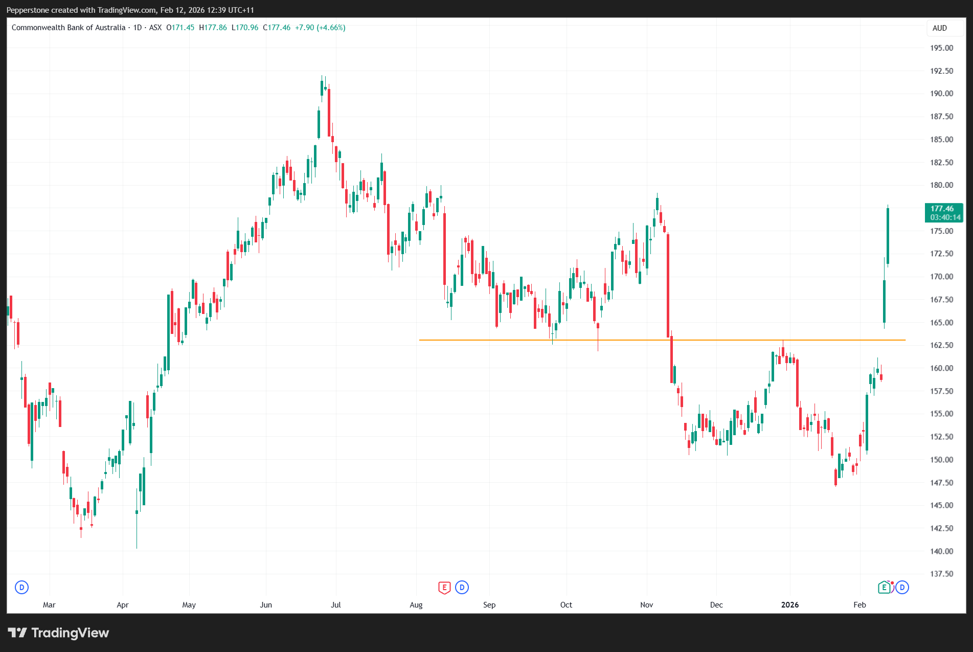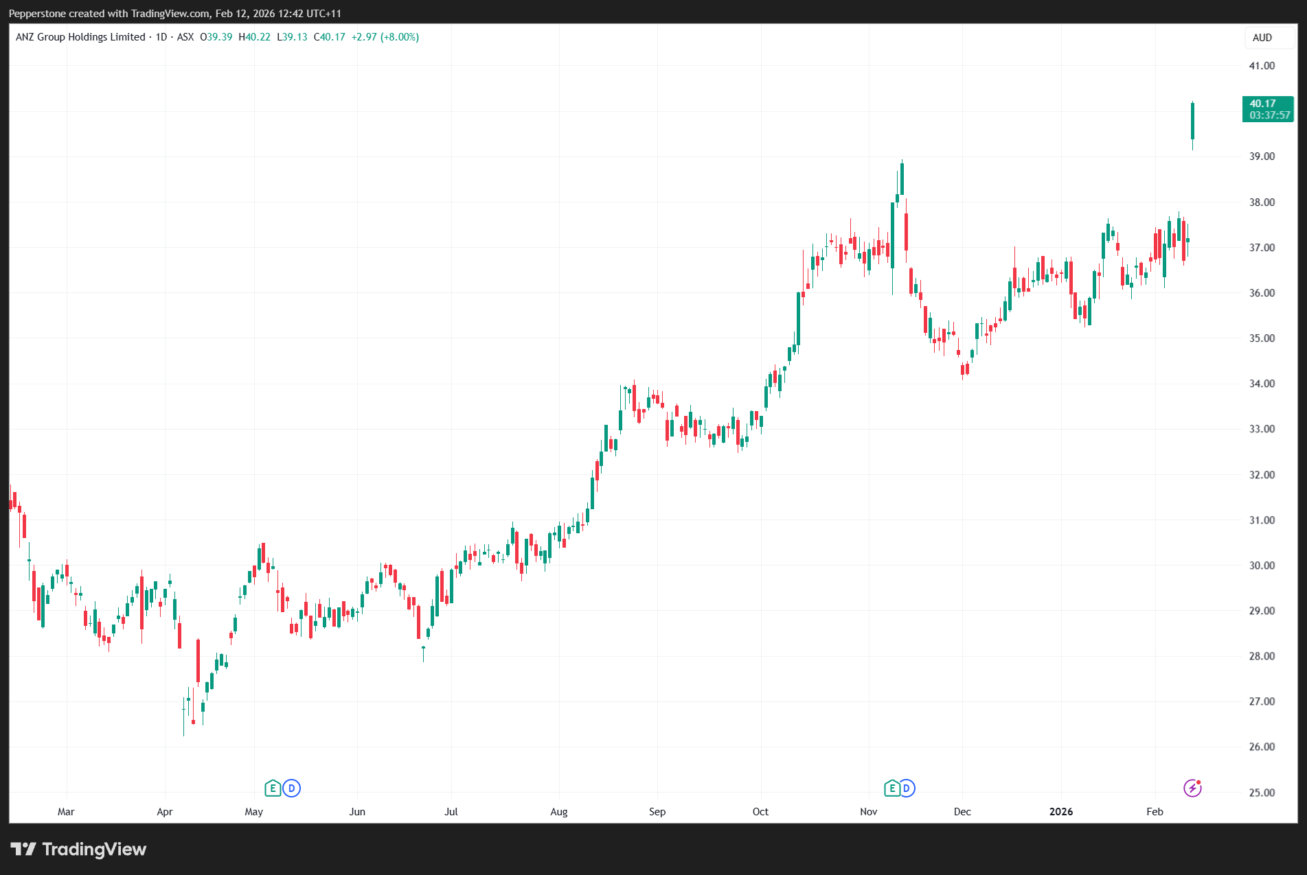 Today (13 February), ANZ released its 1Q26 trading update ahead of 1H26 earnings due in May. The update exceeded expectations, with the stock gapping to $39.39 on the open before pushing into fresh all-time highs. The strength in ANZ further reinforces the positive tone across the major banks.