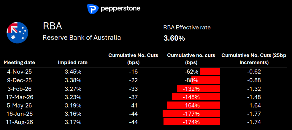 • Aussie interest rate swaps price in 16bp of cuts for the 4 November meeting (≈62% chance of easing).