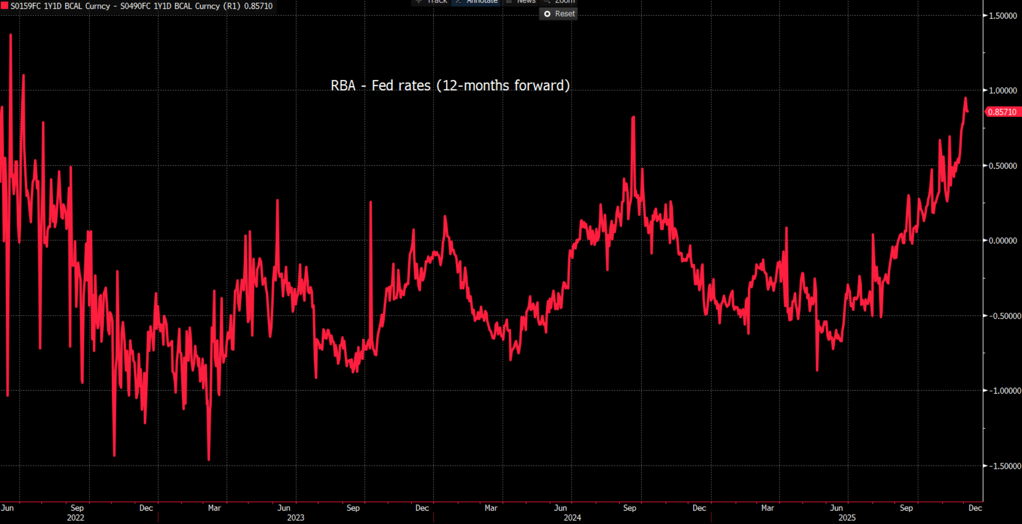 The relative shift is even more striking when comparing the markets pricing for the RBA vs Fed future policy paths. The market’s implied 1-year forward spread has surged from –86bp to +86bp - an extraordinary swing and signalling diverging central-bank trajectories.