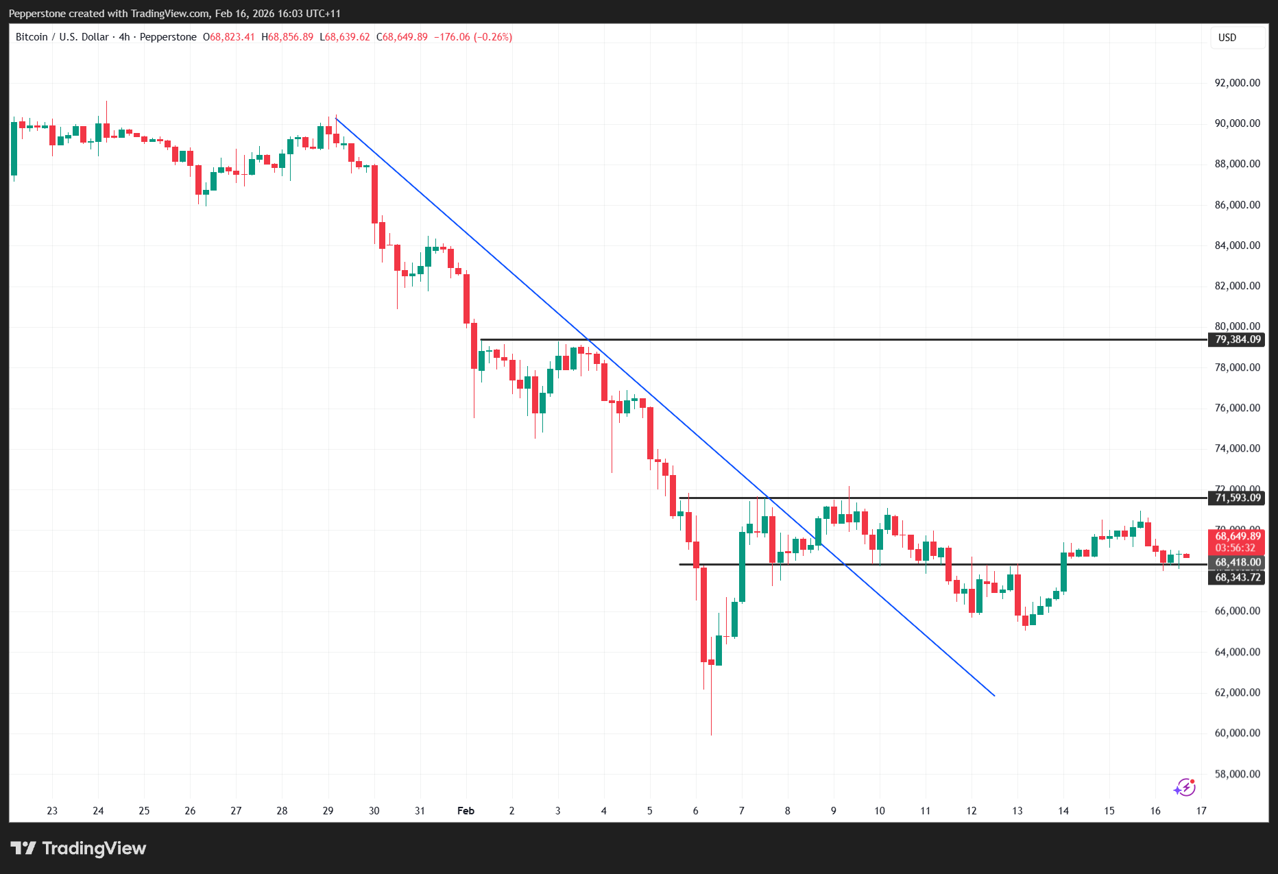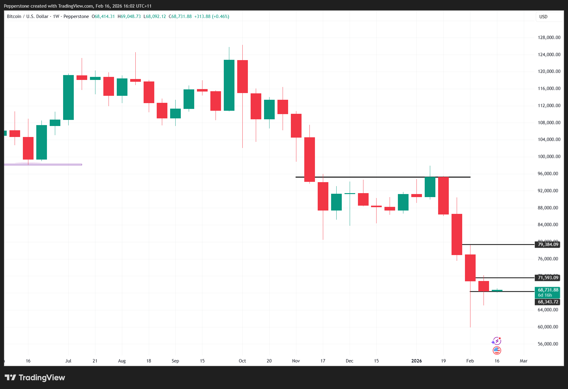 Last week’s closing level at $68,418 based on Pepperstone pricing provides a useful reference point. Bulls will likely use that close as a pivot level in assessing whether momentum is stabilising or deteriorating further.