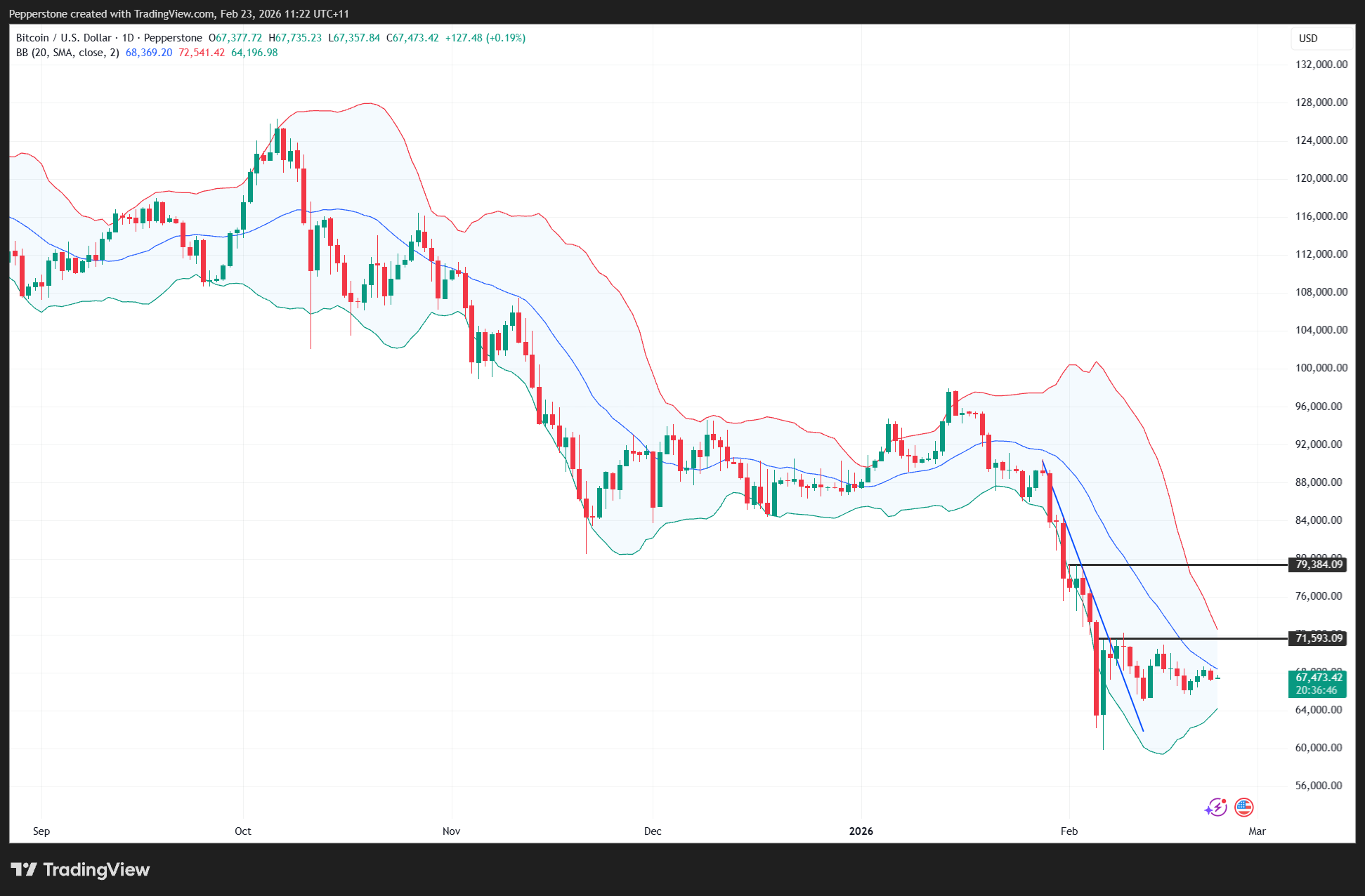 Since 6 February, Bitcoin has traded in a tight range, with price capped near $71,500 and supported around $65,270. The bulls have failed to push higher, yet the bears have been equally unable to force a decisive breakdown.