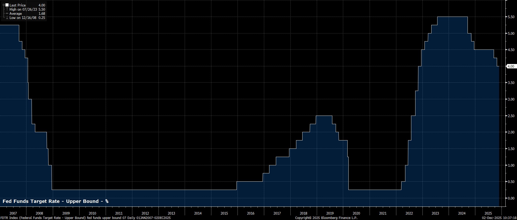Despite Chair Powell, at the October press conference, noting that a cut this time out is ‘far from’ a foregone conclusion, it indeed appears that the FOMC will deliver a third straight 25bp cut at the upcoming confab, lowering the target range for the fed funds rate to 3.50% - 3.75%.
