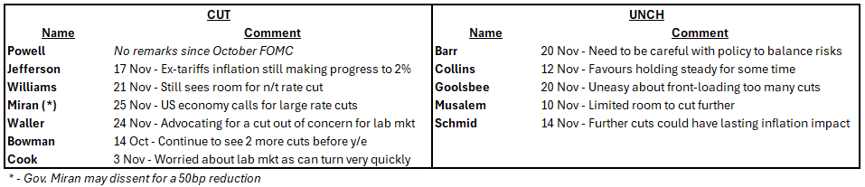 While Chair Powell has made no public remarks since the October presser, it can be reasonably assumed that he is in favour of another 25bp cut, given the lack of hawkish pushback on market expectations. He is likely to be joined in such a vote by those outlined in the above table, while there is a chance that Powell plumping for a cut could also swing some of the more undecided hawks, such as Governor Barr, and Chicago Fed President Goolsbee, in favour of such a move as well. Governor Miran, meanwhile, is likely to prefer a larger 50bp cut at this meeting, though has stated he will vote in favour of a 25bp cut if his vote is the marginal one.