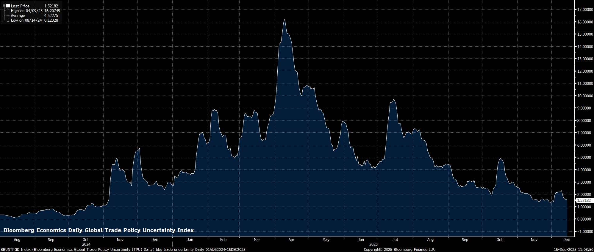 On the trade front, after the US and China agreed a renewed, and longer, trade ‘truce’ at the end of October, uncertainty in terms of tariffs has continued to dissipate, with calmer tones continuing to prevail between the two superpowers, especially as both Trump and Xi see each upholding their own sides of the deal. While a verdict in the IEEPA case is still being awaited, the Supreme Court may not make a ruling on that front until the new year, and in any case the Trump Admin have other tariff powers they could rely on, if the present levies are ruled illegal.