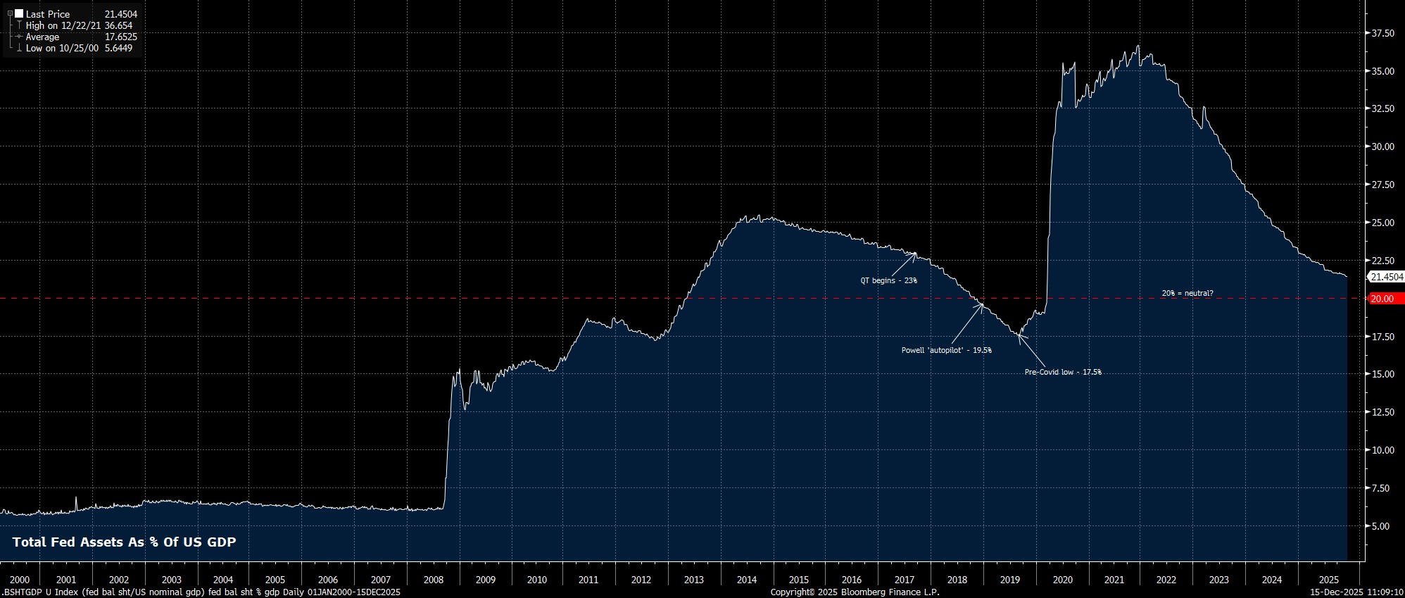 As for monetary policy, the direction of travel remains clear – towards neutral. Having delivered a third straight 25bp cut at the conclusion of the December meeting, the FOMC are set for further rate cuts into the new year, especially with Chair Powell having confirmed that a hike isn’t anyone’s base case in the short-term. Not only is the fed funds rate on its way back towards a 3ish% neutral level, but the balance sheet has also bottomed out at a neutral level around 20% of GDP, with the Fed having now resumed purchases of Treasury bills, purely for reserve management purposes.
