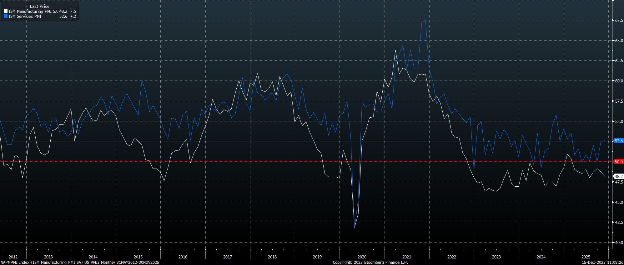 The US economy continues to expand at a solid clip, with the Atlanta Fed’s GDPNow model pointing to growth of 3.6% on an annualised QoQ basis in the third quarter and, while Q4’s output metrics will be skewed lower by the government shutdown, other indicators point to growth remaining resilient, not least with the ISM services PMI having hit a 9-month high 52.6 last month.