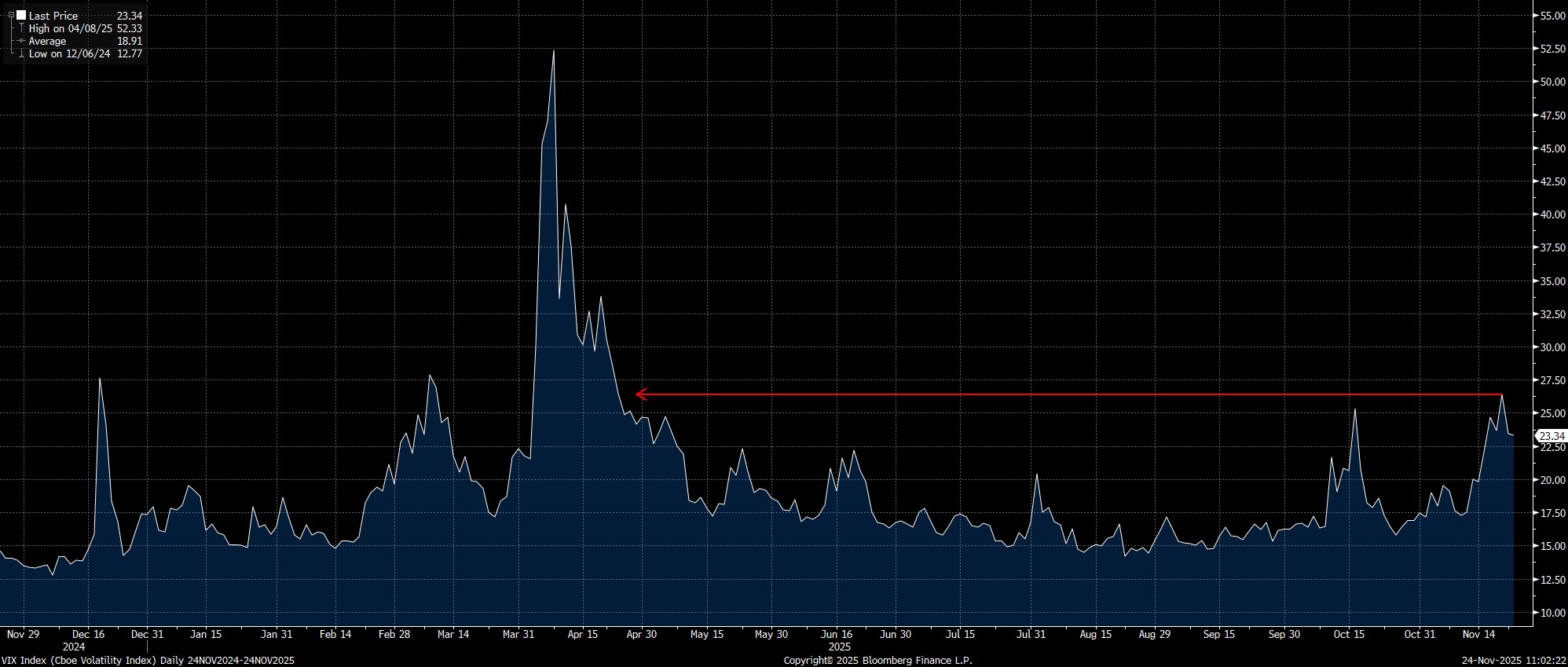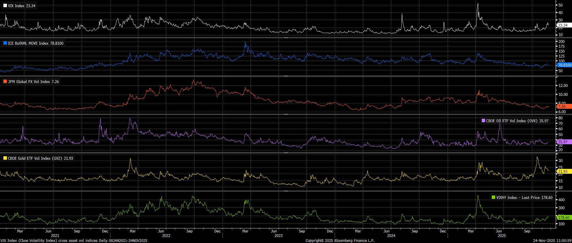 In terms of where we stand at present, equity vol has seen a notable uptick over the last week or so, with the VIX briefly notching its highest daily close since the ‘Liberation Day’ episode in April, amid the chunky stock sell-off on Wall Street. Though this sell-off had no obvious catalyst behind it, the VIX was driven higher not only by increased realised vol, but also by a surge in hedging activity in the options space, primarily as participants sought to protect what, for many, are very healthy YTD gains.