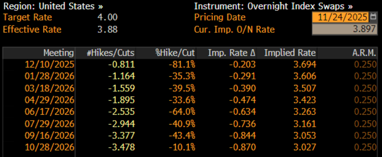 Probably the most important of all is the monetary policy outlook stateside, particularly with there being little-to-no consensus as to how the December FOMC meeting will likely pan out. While the USD OIS curve currently discounts around an 80% chance of a 25bp cut at the final confab of the year, such a move seems far from a ‘done deal’, with recent remarks from policymakers indicating that the Committee is split almost 50/50 between another cut, and standing pat. There are also plenty oof question marks over the policy path into 2026, with those Committee divisions, based on the outlook at present, likely to make every cut a tighter call than the one that precedes it.