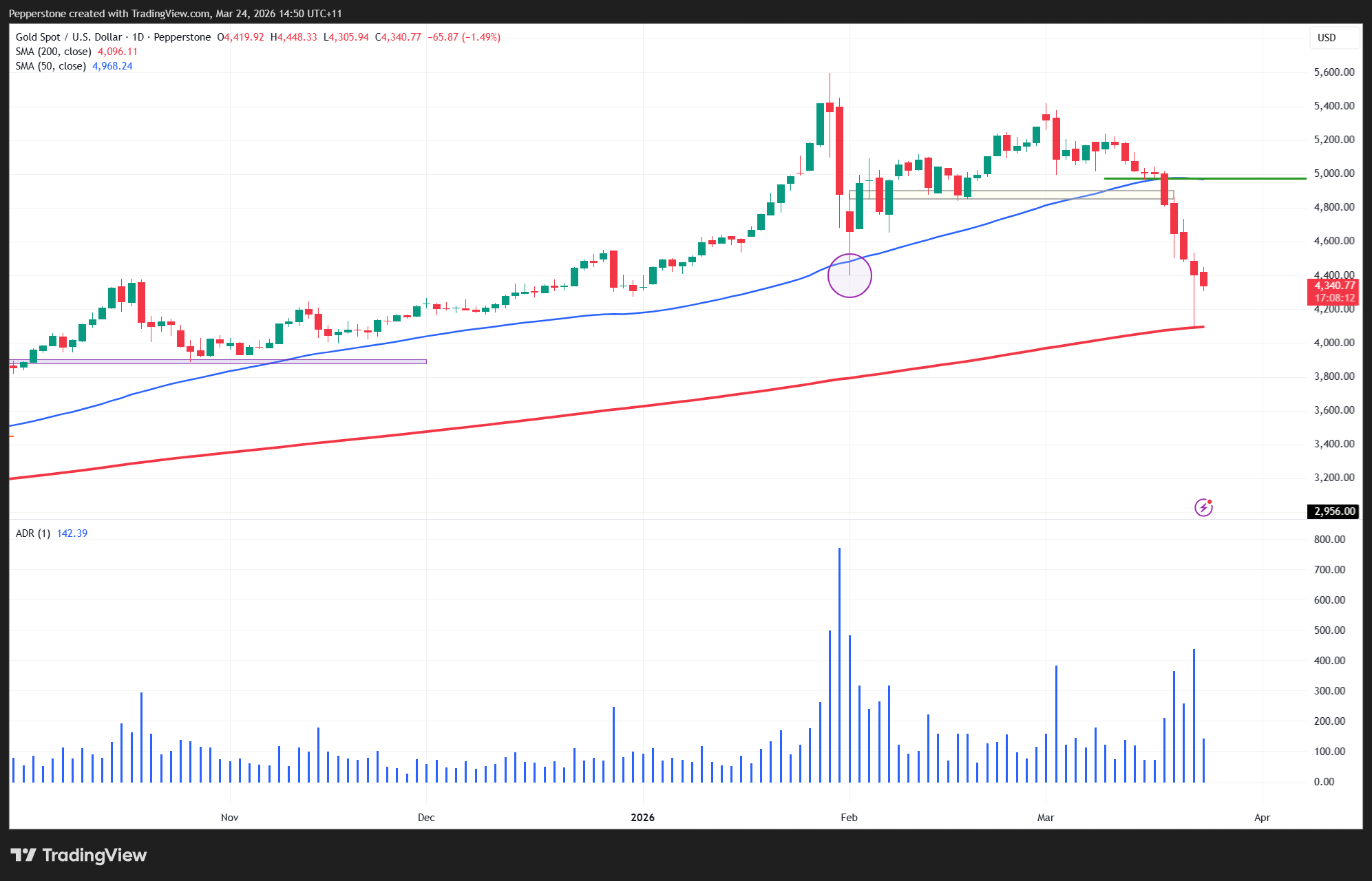 Price action itself has played a critical role in shaping sentiment. On 18 March, XAUUSD broke below 5000 - not just round number support but a level that marked clear indecision (highlighted by doji candles) in the two days prior, as well as the 50-day MA. This breakdown triggered a shift in market structure, with a clear pattern of lower highs and lower lows emerging. The result has been sustained downside momentum, with gold declining for an extended period.