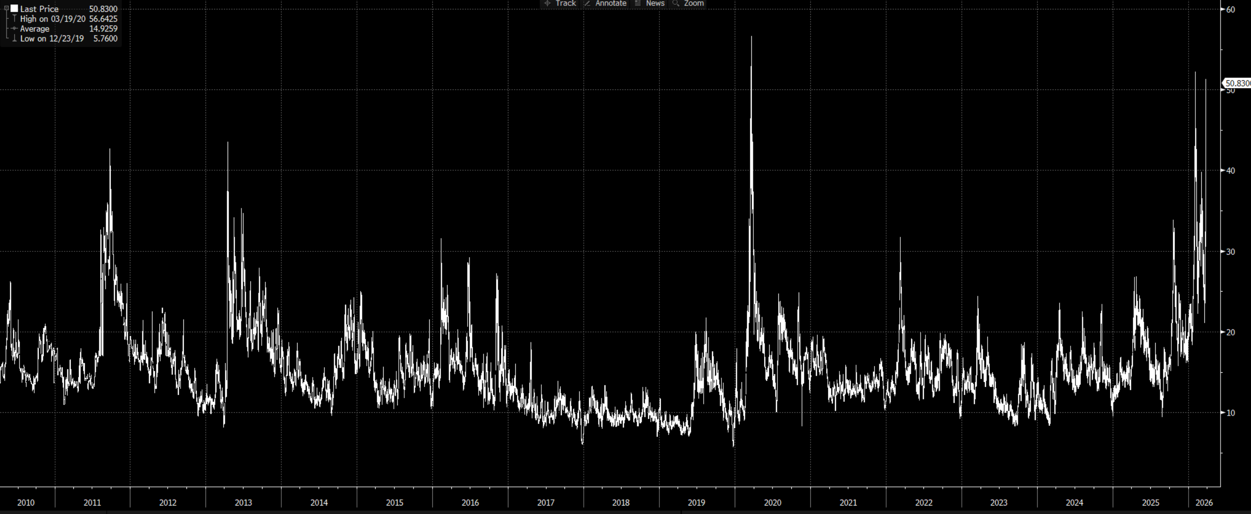 Volatility in gold is at exceptionally elevated levels. One-week at-the-money implied volatility has risen above 50%, placing it among the highest readings of the past decade. This implies average daily price swings of around 3.2%, highlighting the intensity of current trading conditions.