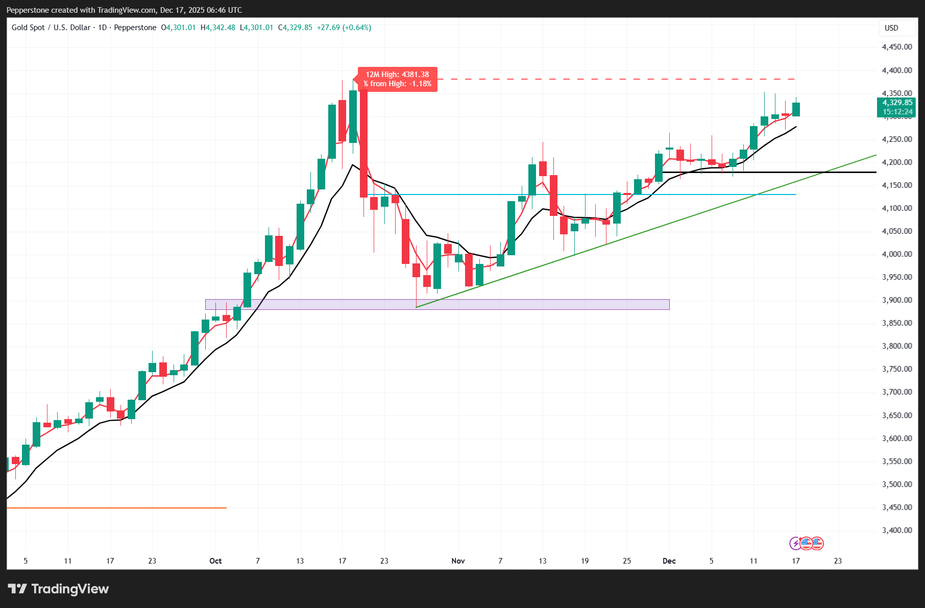 While this CPI outcome may prove different, any scenario that keeps Fed rate cuts in play for 2026 is likely to be sufficient to attract buyers back into gold. With technical momentum building, institutional flows supportive, and macro conditions remaining broadly constructive, gold appears well positioned to cap off 2025 as one of the year’s standout performers, with fresh all-time highs firmly in sight.