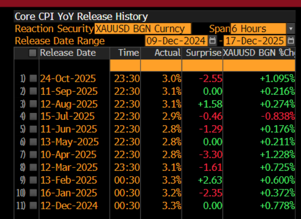 With US nonfarm payrolls now behind us, traders looking to build positions may show some hesitation ahead of the upcoming US CPI inflation report. CPI remains a key event risk capable of shaping broader market sentiment into year-end, and some restraint in positioning is understandable. That said, gold’s historical performance around US core CPI releases offers comfort to the bulls.