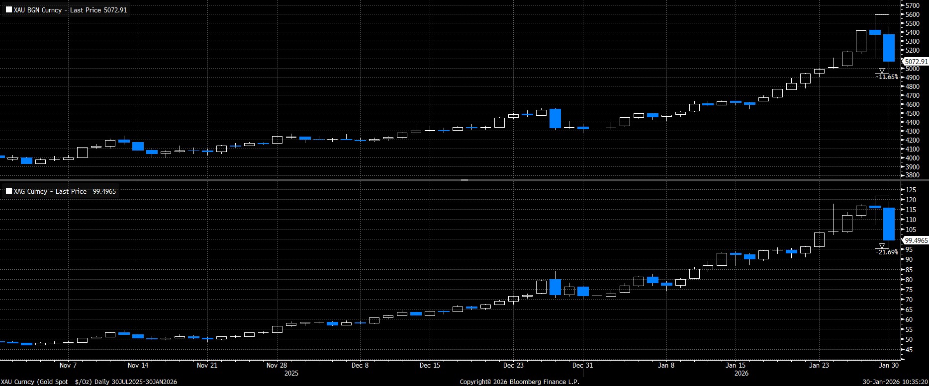 Certainly, the rather dramatic moves that we’ve seen across the precious metals space over the last couple of trading sessions emphasise the dramatic nature of the pullback from record highs printed early on Thursday. Spot gold, for instance, has slumped 12% since then to trade back beneath $5,000/oz, while spot silver has tumbled over 20% in the space of two days, breaking back below $100/oz.