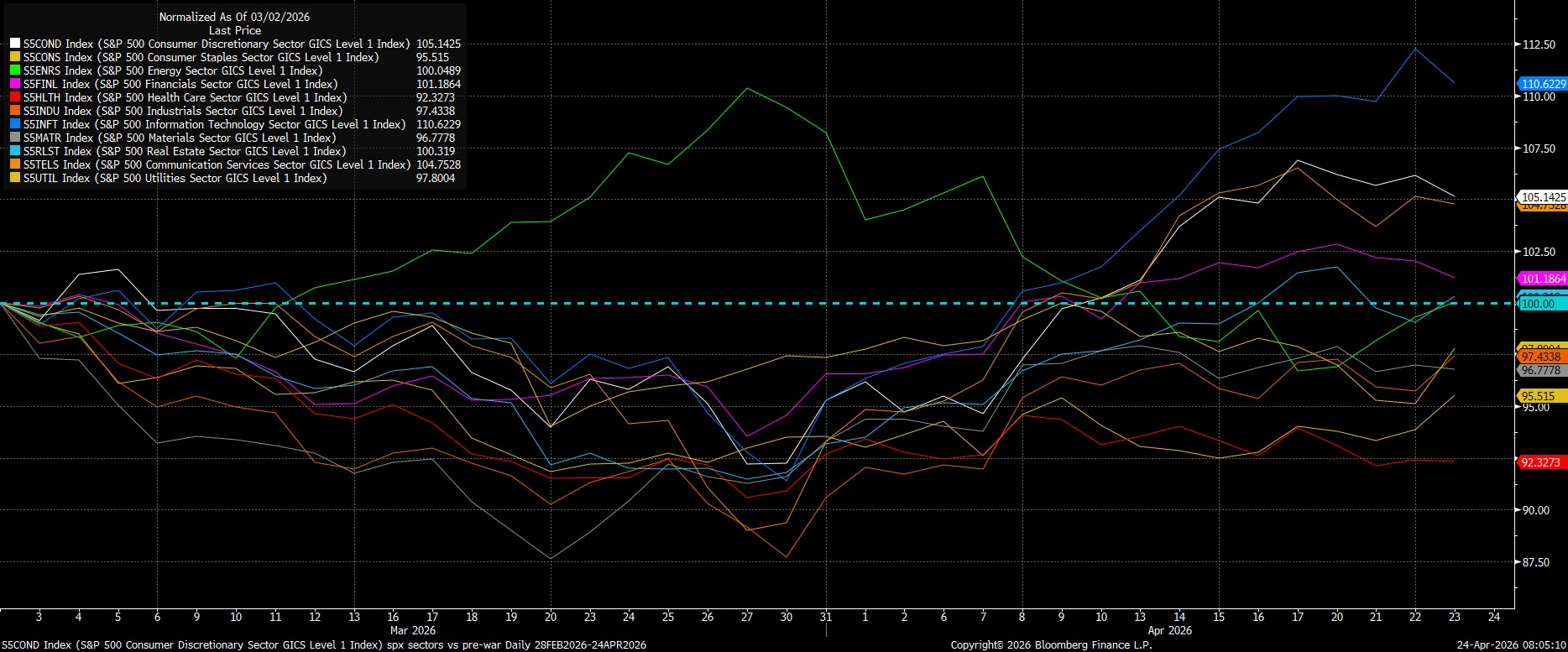 For instance, we’ve seen, in the last couple of weeks, a marked resurgence in enthusiasm around the broader AI theme. Perhaps, the significant cheapening of tech valuations at the beginning of the conflict was enough to entice participants to re-up allocations to the sector, while solid earnings from the likes of TSMC, ASML, and Intel have likely also helped to reignite some of the euphoria on this front, ahead of next week’s megacap earnings where five of the ‘magnificent seven’ (AAPL, AMZN, GOOG/L, META & MSFT) are set to report.