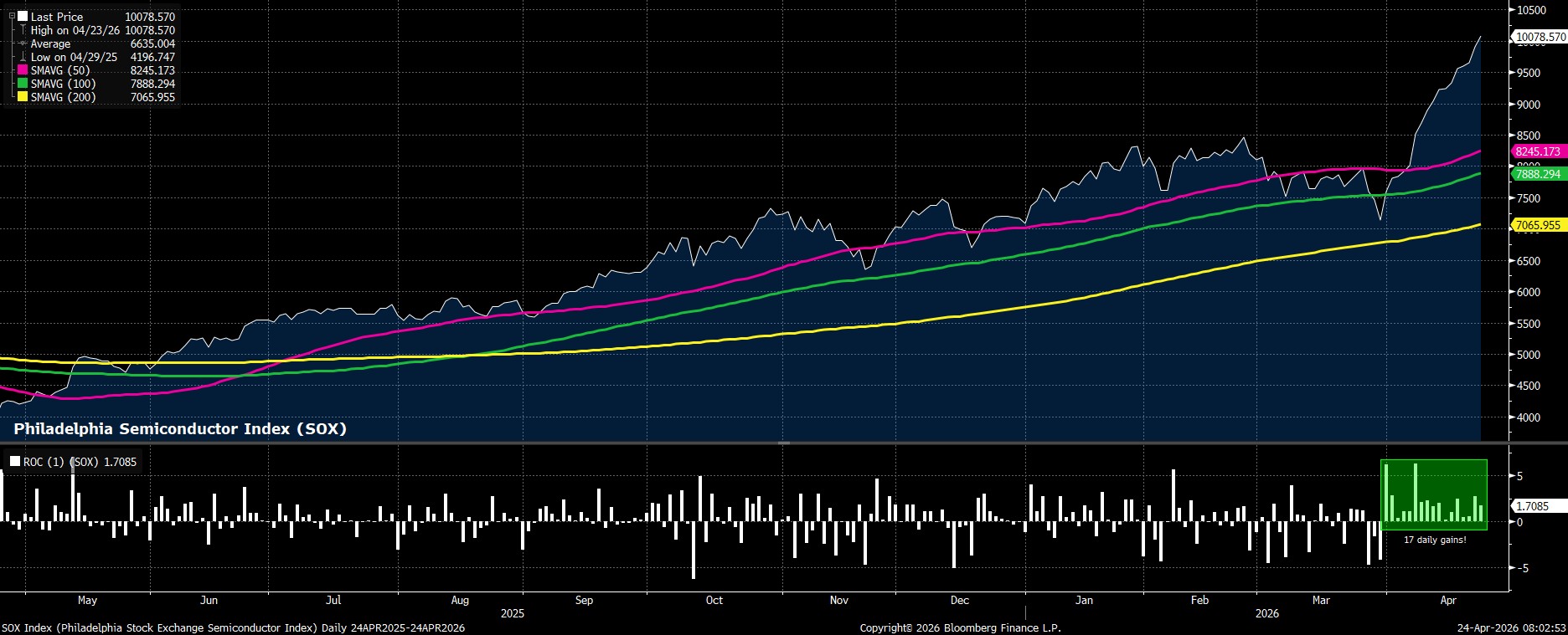 Altogether, these factors have driven the Philadelphia Semiconductor Index not only to a record high, but to an incredible 17-day winning streak. Considering the chunky weights that many of these names have in major equity benchmarks, this has hence dragged the broader market higher too.