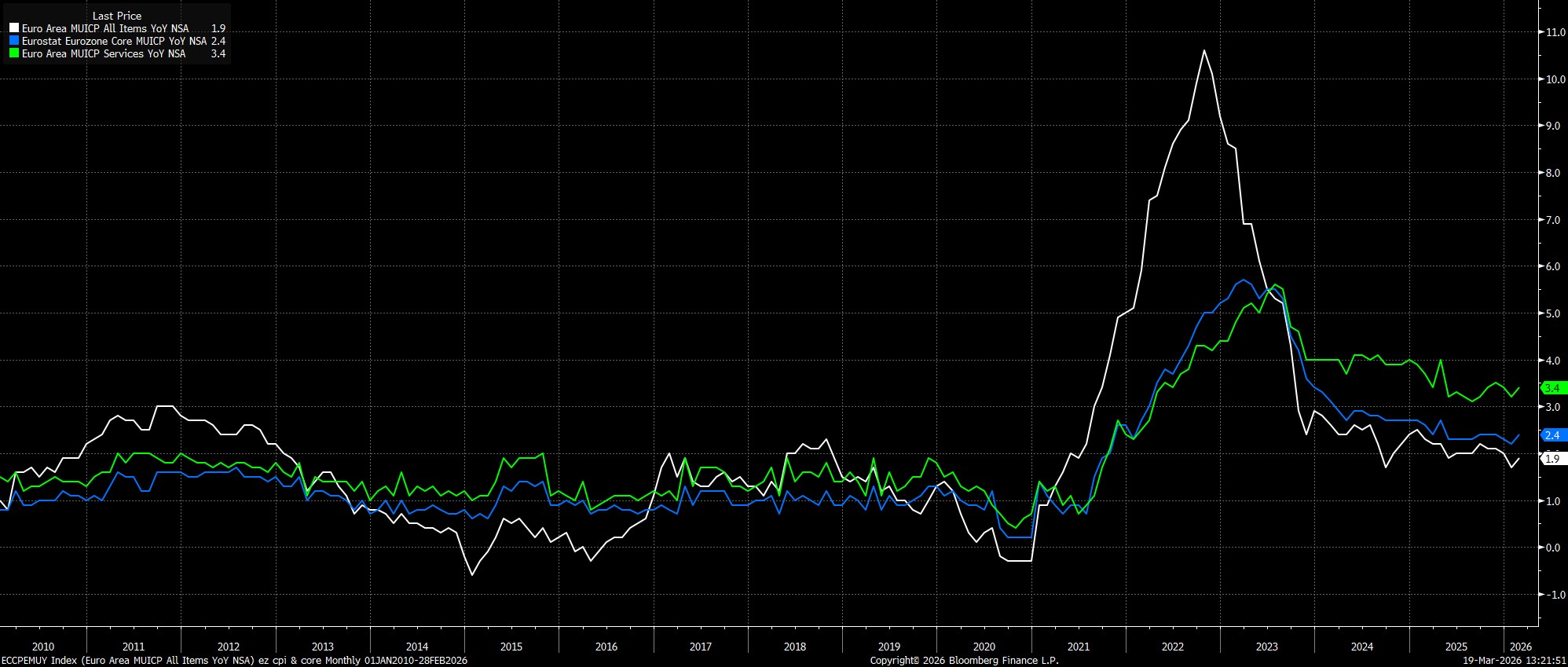 Regardless, on inflation, headline CPI is now seen at 2.6% this year, up from the 1.9% expectation in December. That ‘hump’ in price pressures is likely to be short-lived, however, with HICP then seen returning to the 2.0% target in both 2027, and 2028.