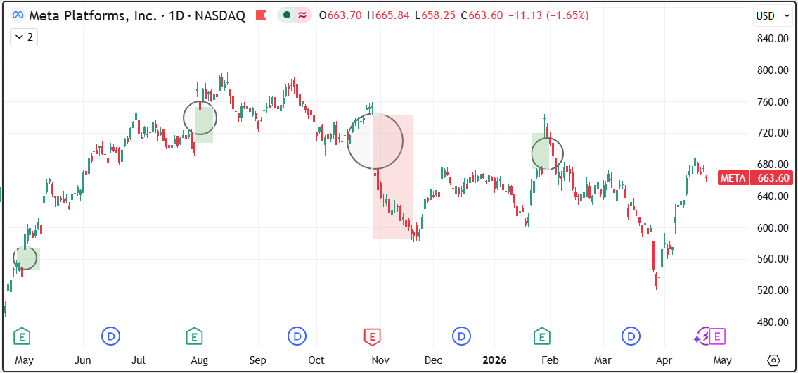 Over the past two quarters, Meta Platforms stock has followed a pattern combining correction and trend rebuilding. In Q4 last year, the stock reached highs near $780 before coming under sharp selling pressure in November, with a rapid decline toward the $600 area after reporting a one-off tax item of more than $15 Billion that caused nearly 80% miss in net income. At the start of Q1 2026, the stock entered a phase, where optimism around revenue growth was balanced by caution on margins due to heavy AI-driven spending.