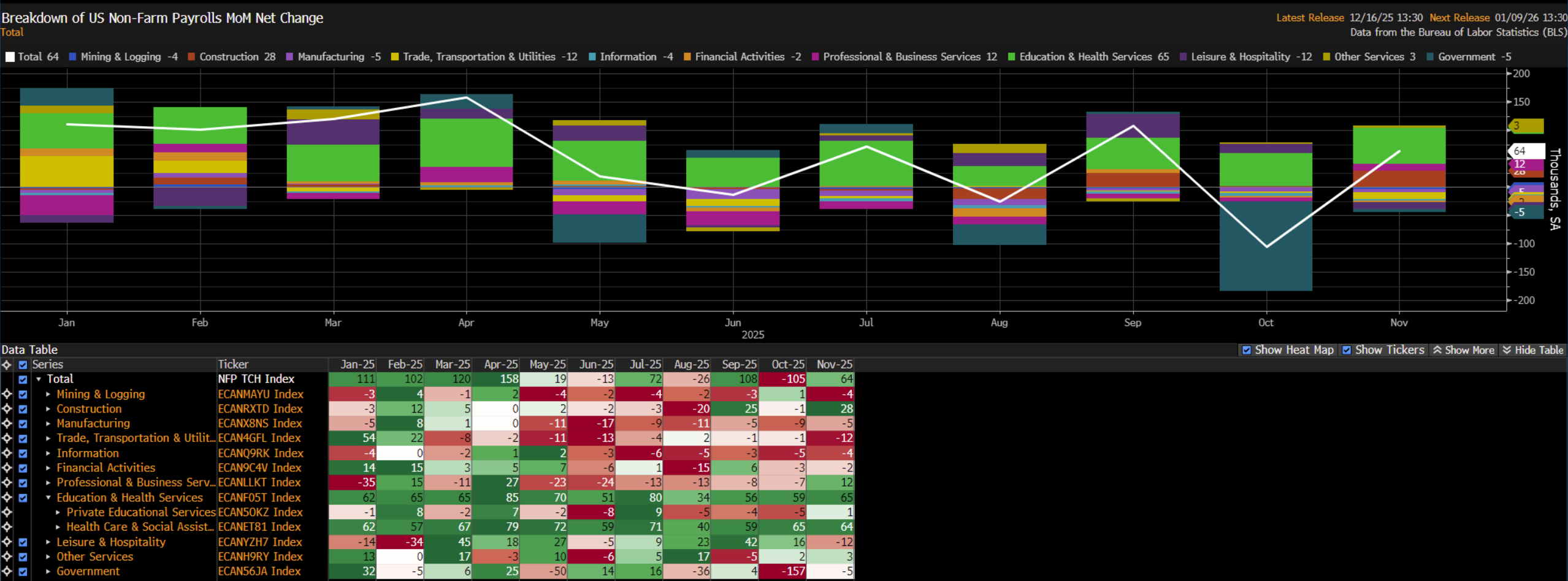 Headline nonfarm payrolls rose by +64k in November, modestly above consensus expectations for an increase of +50k, and following payrolls having fallen by a sizeable -105k in October, with that latter datapoint being released in conjunction with the November report, owing to delays resulting from the government shutdown.