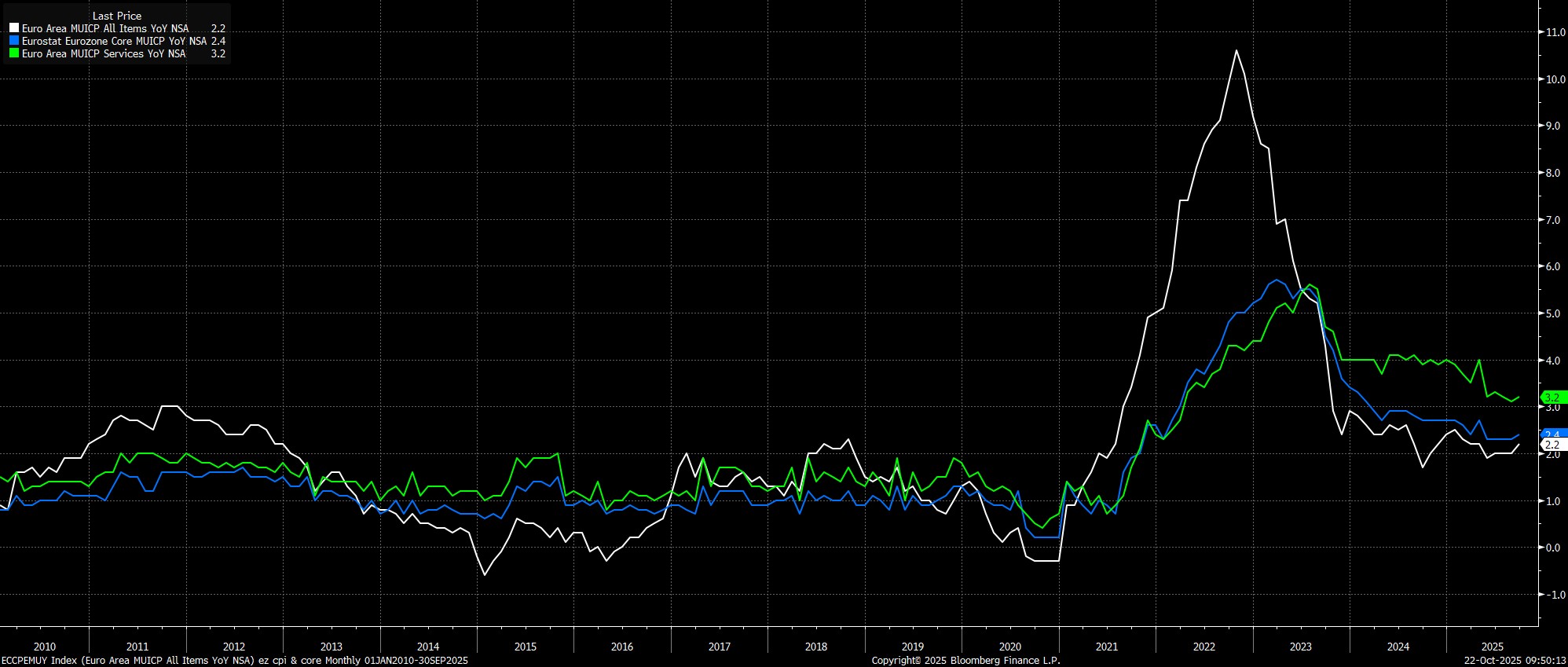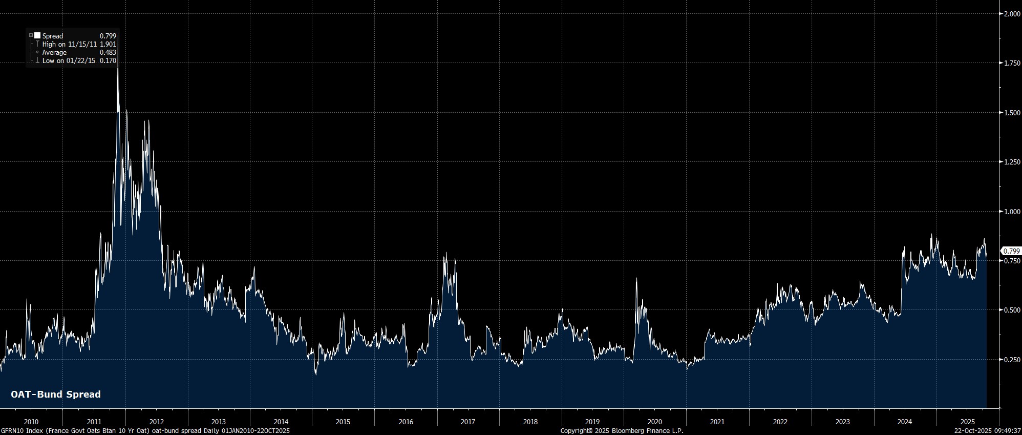 Meanwhile, although the situation remains an unstable one, for the time being at least it appears that French political risks have notably subsided, with PM Lecornu winning a couple of confidence votes, and now looking likely to pass a budget before year-end. Of more importance to the ECB, is that while remaining wider than would be desired in an ideal world, the OAT-Bund spread has stabilised of late, thus reducing the risks of the aforementioned political pantomime impairing monetary policy transmission.