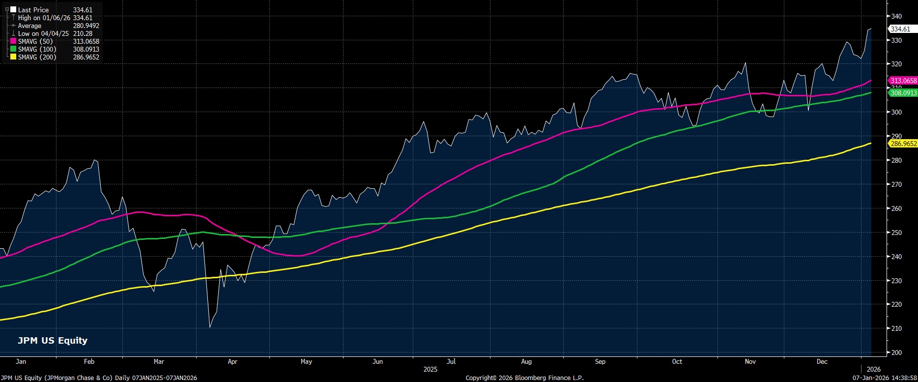 JPMorgan traded well in 2025, rallying around 35% over the course of the year, comfortably outperforming the S&P 500, and the financials sector. The stock remains an index heavyweight, standing as the 13th largest name in the S&P, while also being a Dow constituent, with a 4.1% weight in the average. For the upcoming report, options tied to the stock price a move of +/-3.2% in the 24 hours post-release, though JPM has sold-off over that period following each of the last two quarterly reports. This time out, consensus expects adjusted EPS at $5.01, on revenues of $46.4bln.