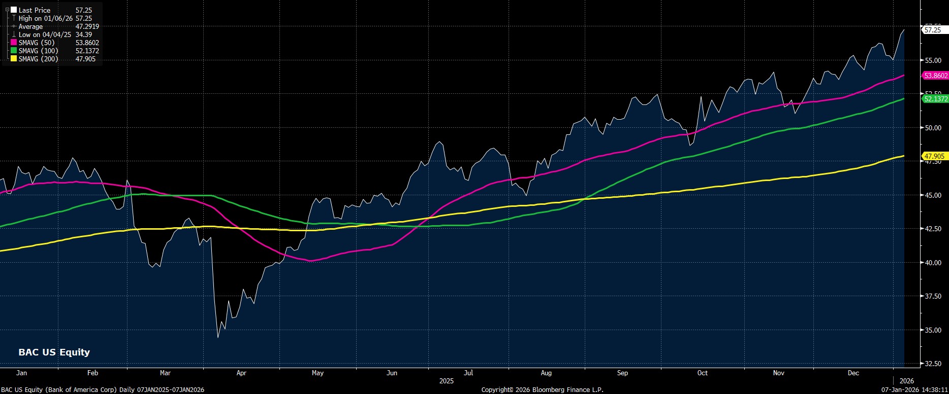 Citi stood as the best performing major US bank last year, rallying a notable 66% in 2025, making the bank the 27th best performer in the S&P, having even outperformed Alphabet (GOOG/L). Also of note is that C’s price-to-book ratio has now moved back above 1, for the first time in seven years, implying that the bank is again viewed as being worth the sum of its parts. In any case, options on the stock imply a +/-4% move over the Q4 25 report, with the name having advanced post-earnings on each of the last 4 occasions. This time out, the street foresees adjusted EPS at $1.62, on revenues of $20.6bln.