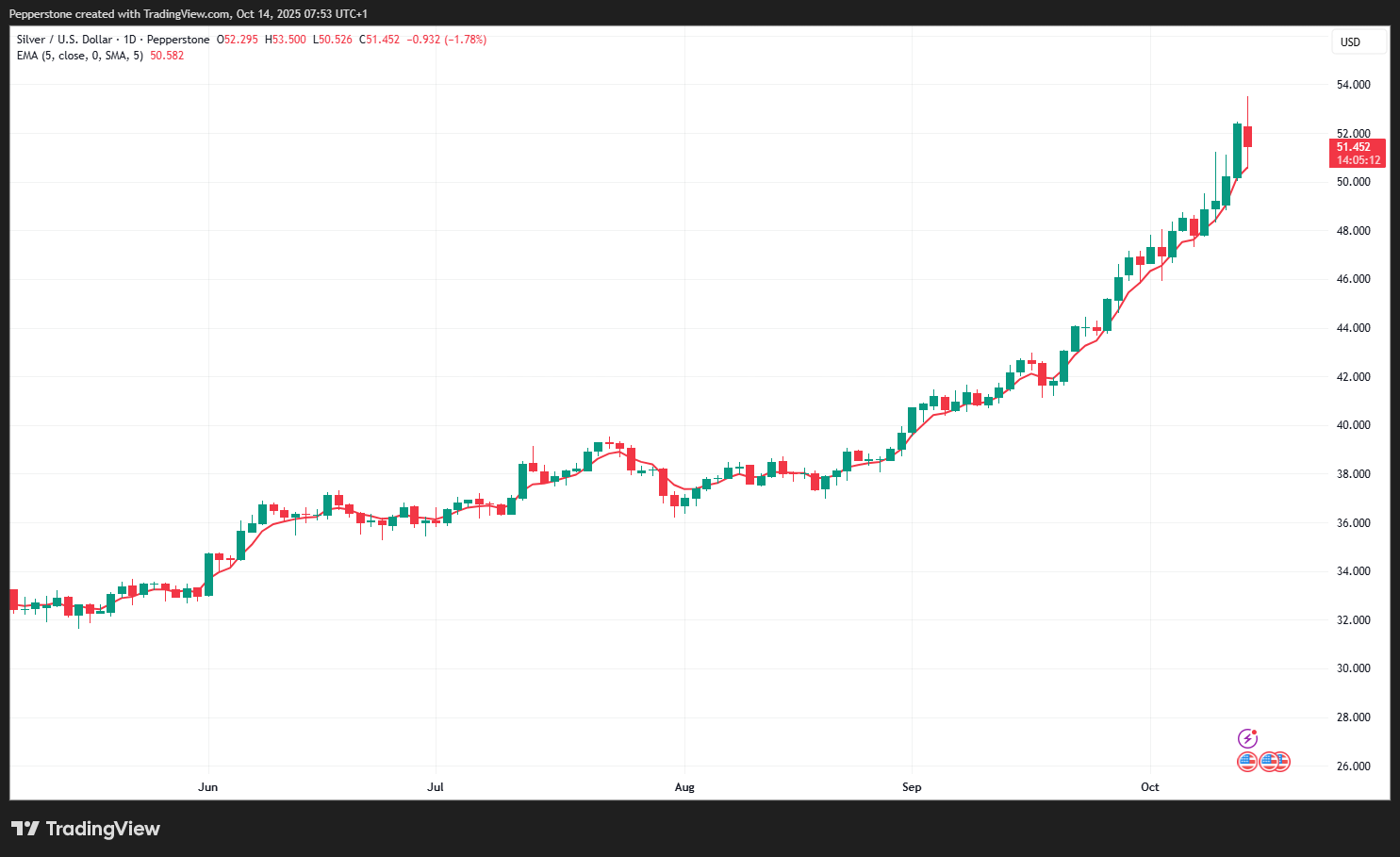 Technically, silver has been overbought since September, and while the momentum has been relentless, sellers are starting to emerge, increasing the risk of broader profit-taking. Many traders are eyeing opportunities to buy into weakness, but the ongoing bull trend could face a setback if we see a daily close below $50.01 (Monday’s low) or $49.80 (the April 2011 high). A close below the 5-day EMA would also signal a potential shift in bullish momentum and could lead to more volatile, whippy price action.