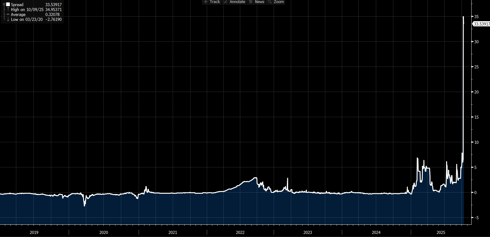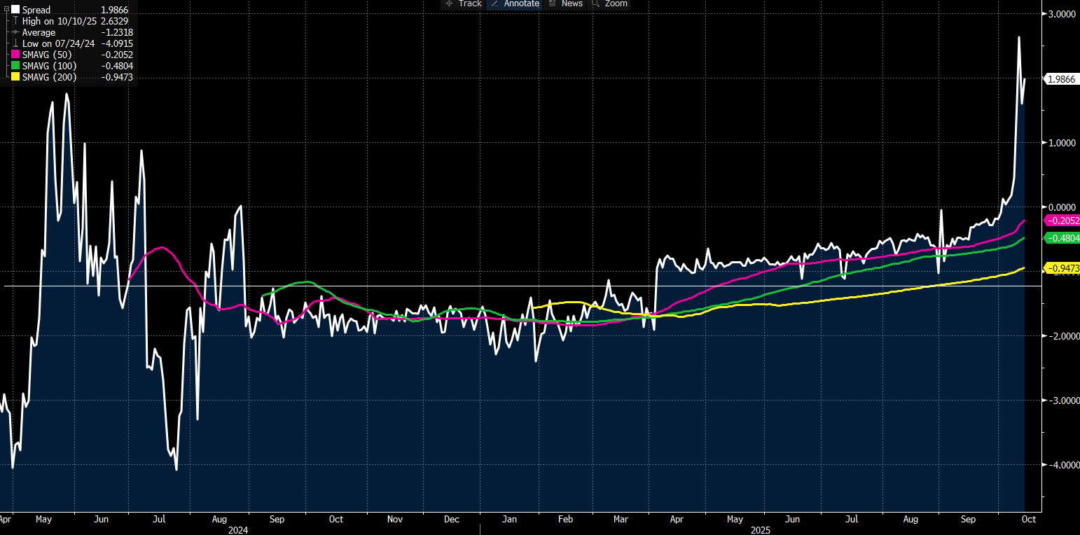 This shortage is also reflected in the premium between spot and COMEX futures. Last week, the spread blew out to $2.63, before narrowing to $1.98. While that retracement seems steep, it’s noteworthy that spot silver typically trades at a discount to front-month futures — highlighting just how extreme current supply stress has become.