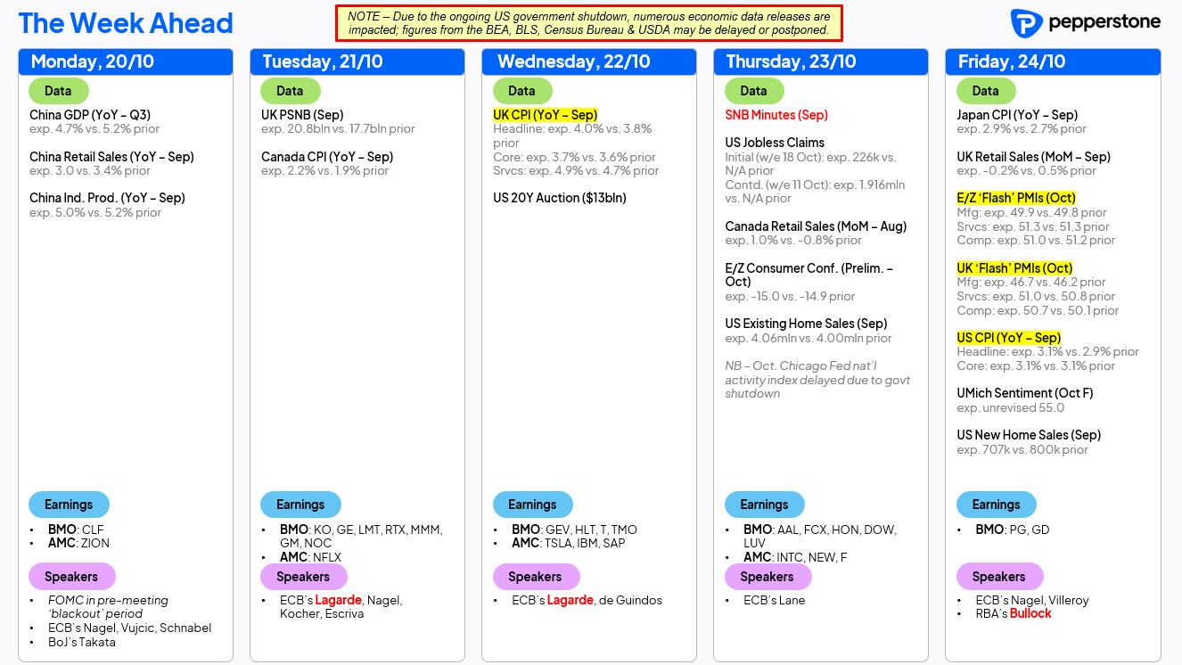 That said, we will at least get the September US CPI figures this week, with that print on Friday highlighting the data docket. Both headline and core CPI are seen having risen by 3.1% YoY last month, as tariff-induced price pressures continue to make themselves known, though it’s very tough indeed to imagine the data materially altering the Fed policy outlook, with 25bp cuts this month, and in December, effectively locked in amid mounting downside labour market risks.