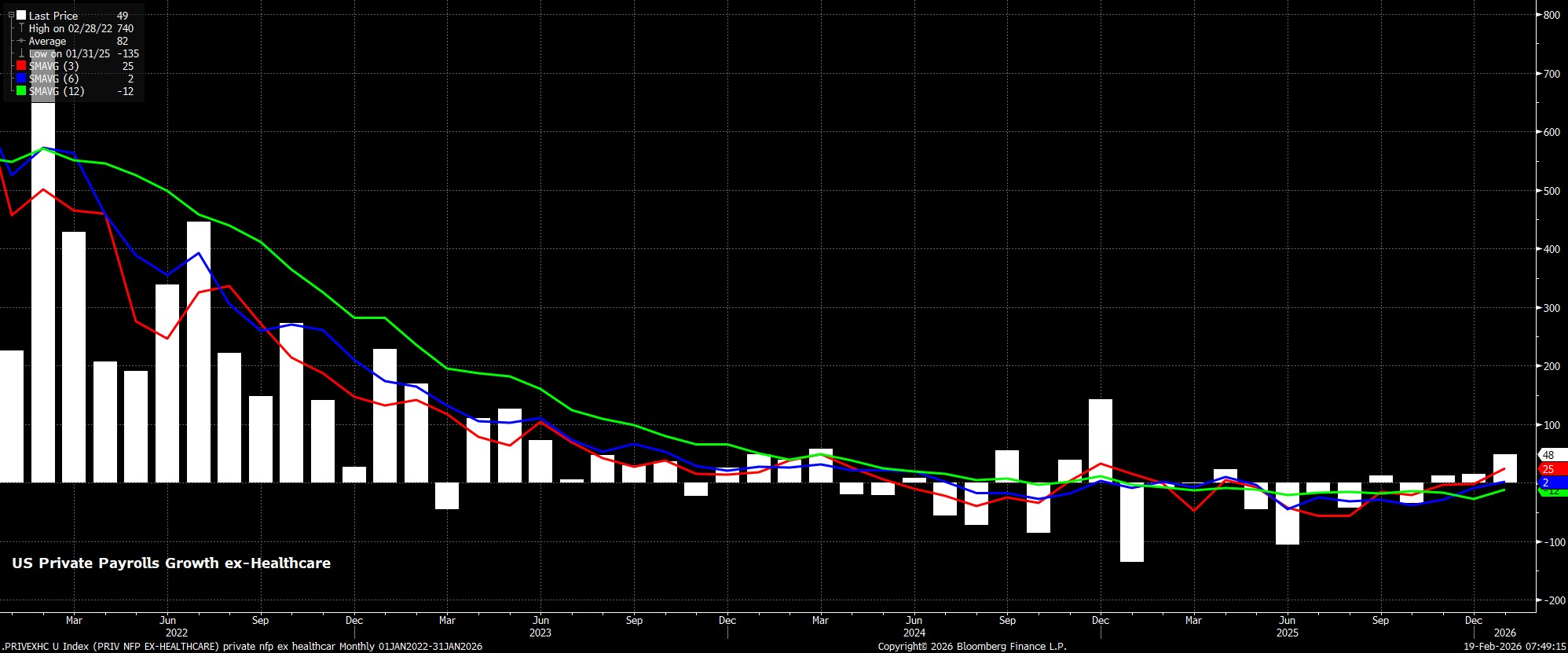 From a payrolls perspective, jobs growth remains highly concentrated in a handful of sectors, primarily healthcare, with the 6-month average of private payrolls growth excluding healthcare essentially zero. In other words, if the healthcare sector weren’t mechanically adding jobs as the population ages, the private sector would be creating no jobs whatsoever.