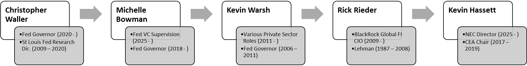 Numerous reports, as well as the White House themselves, have confirmed that the ‘long-list’ of as many as thirteen names has now been whittled down to a ‘final five’, comprising current Fed Governors Waller and Bowman, former Governor Warsh, BlackRock Global FI CIO Rieder, and NEC Director Hassett.