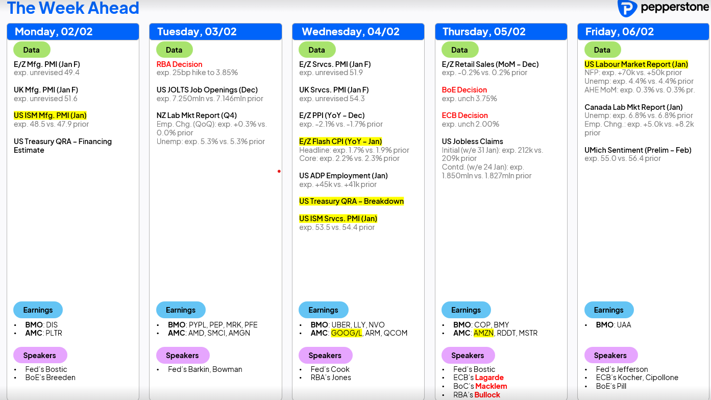 US equity indices will also command attention, with just under 30% of S&P 500 market capitalisation reporting earnings and guidance this week. Alphabet and Amazon are the major heavyweight releases, while trader favourites such as Palantir, AMD, Qualcomm, Iren, Reddit and Barrick are also on the radar.