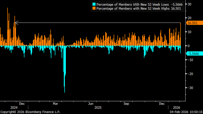 Though all of that sounds like a relatively brutal risk-off day, that wasn’t the case at all. In fact, over half of the individual stocks in the S&P 500 ended the day in the green, despite an 0.8% decline in the index, marking just the 10th time in the last decade that such a dynamic has been on display. Similarly, 16.5% of the S&P made new 52-week highs, the highest proportion since November 2024.