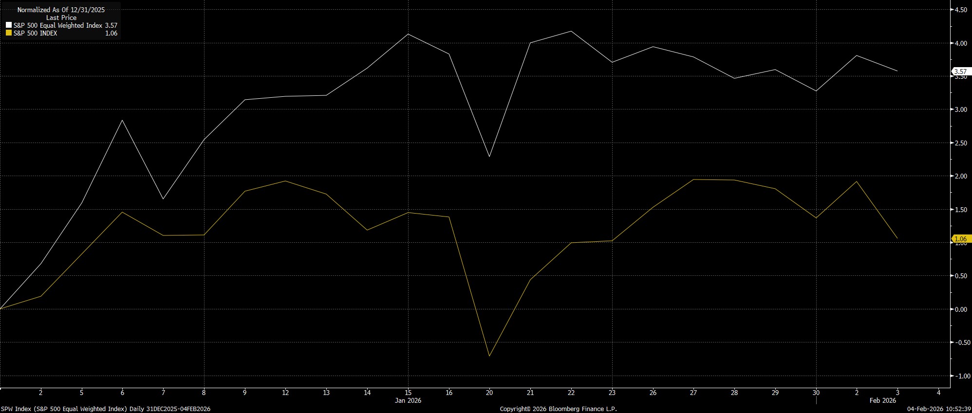 This is where the equal-weighted S&P index can play a role in telling a ‘truer’ story of market performance, removing the skew that the traditional cap-weighted index currently experiences. Here, the story is pretty clear – while the S&P is up around 1% YTD, the equal-weighted index has performed more than three times better.