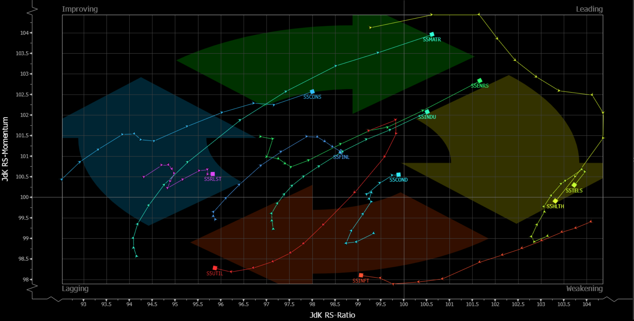 Perhaps the clearest illustration of this churn, though, is below. Over the last six weeks or so, sectors which were previously leading the market higher – namely, Information Technology and Telecoms – have lost momentum, and are now lagging behind the pack. Simultaneously, previous laggards such as Energy, Industrials, and Materials have picked up the mantle and begun to outperform.