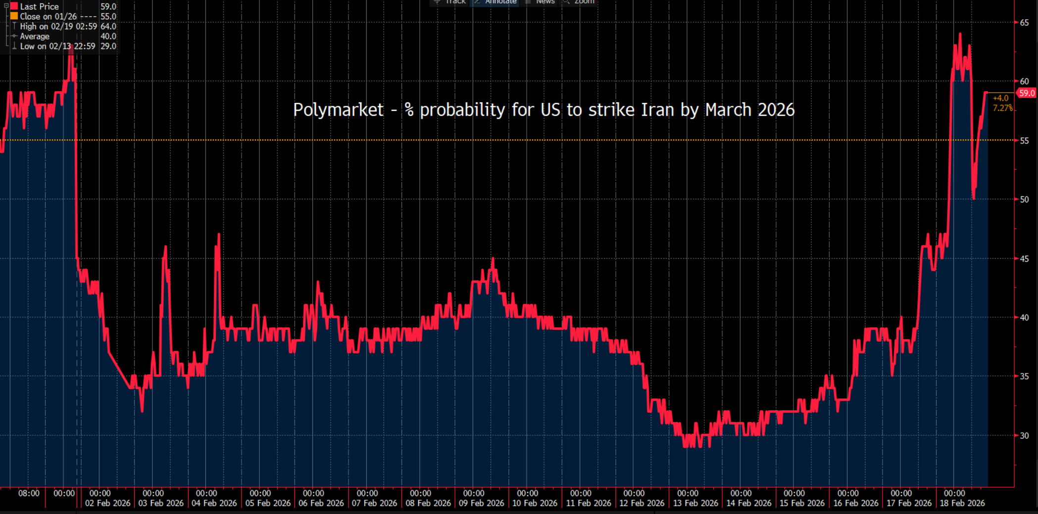 • Odds of a US strike on Iran by the end of March have risen from around 30 percent to 57%, having briefly touched 65%.