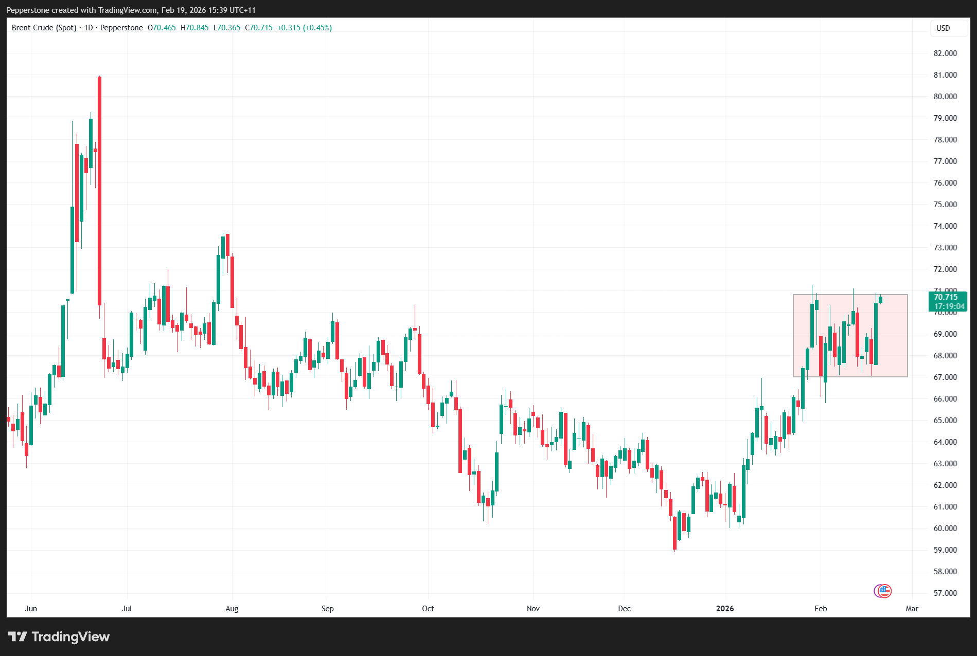 • Brent crude has moved toward $71, testing the upper bound of its $67 to $70 consolidation range.