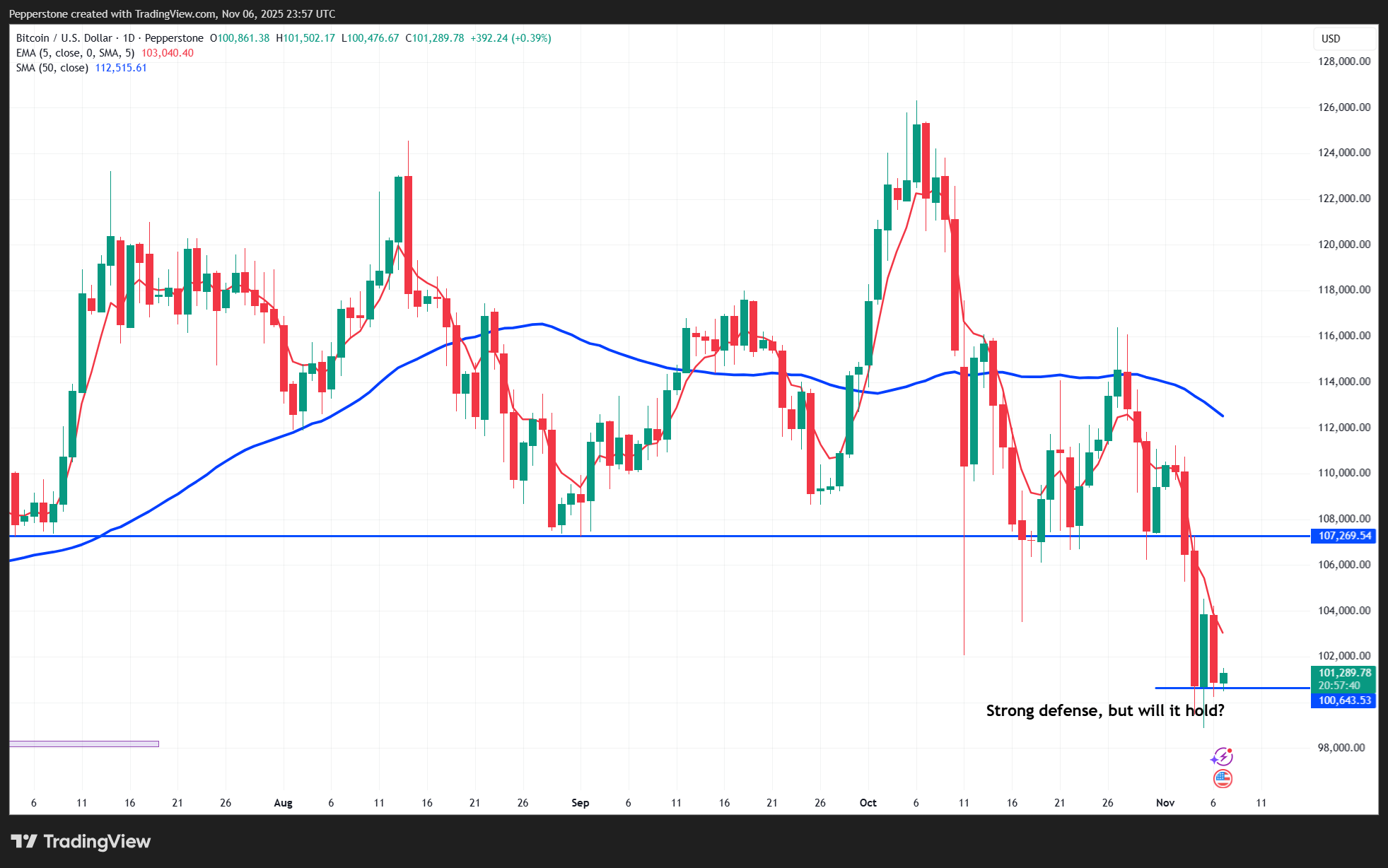 Currently, Bitcoin’s daily chart shows rallies capped at the 5-day EMA, with buyers showing little enthusiasm to push the price back above the former breakdown point near $107K. Bulls continue to defend the psychological $100K level, and whether this area becomes a sustainable floor — forming a platform for a future move higher as liquidity improves — remains the central question.