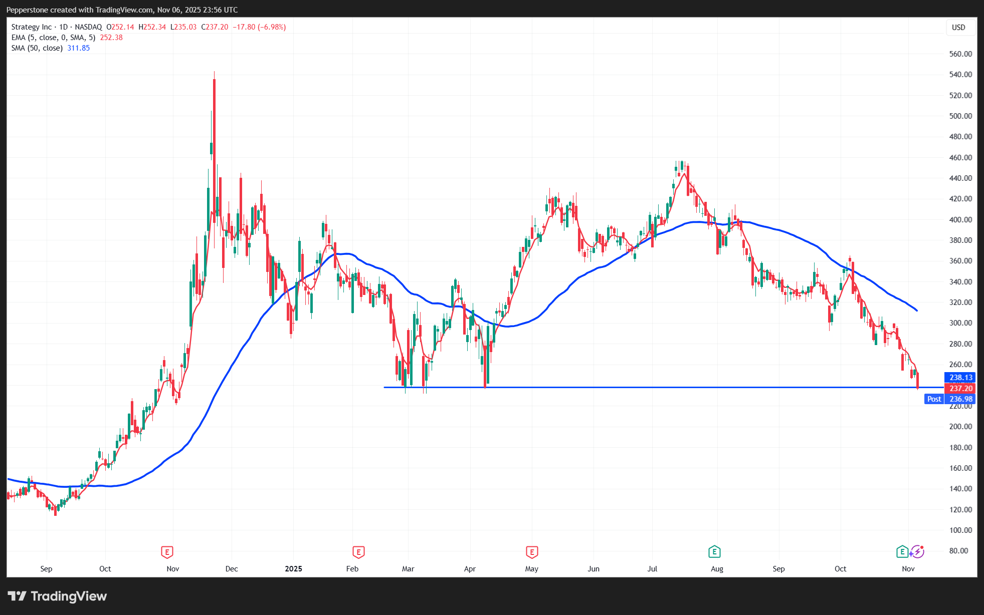 Publicly listed Bitcoin treasury entities are also feeling the heat. Notably, MicroStrategy’s equity — often seen as a leveraged proxy for BTC exposure — is down 48% from its July highs, amplifying pressure on sentiment.