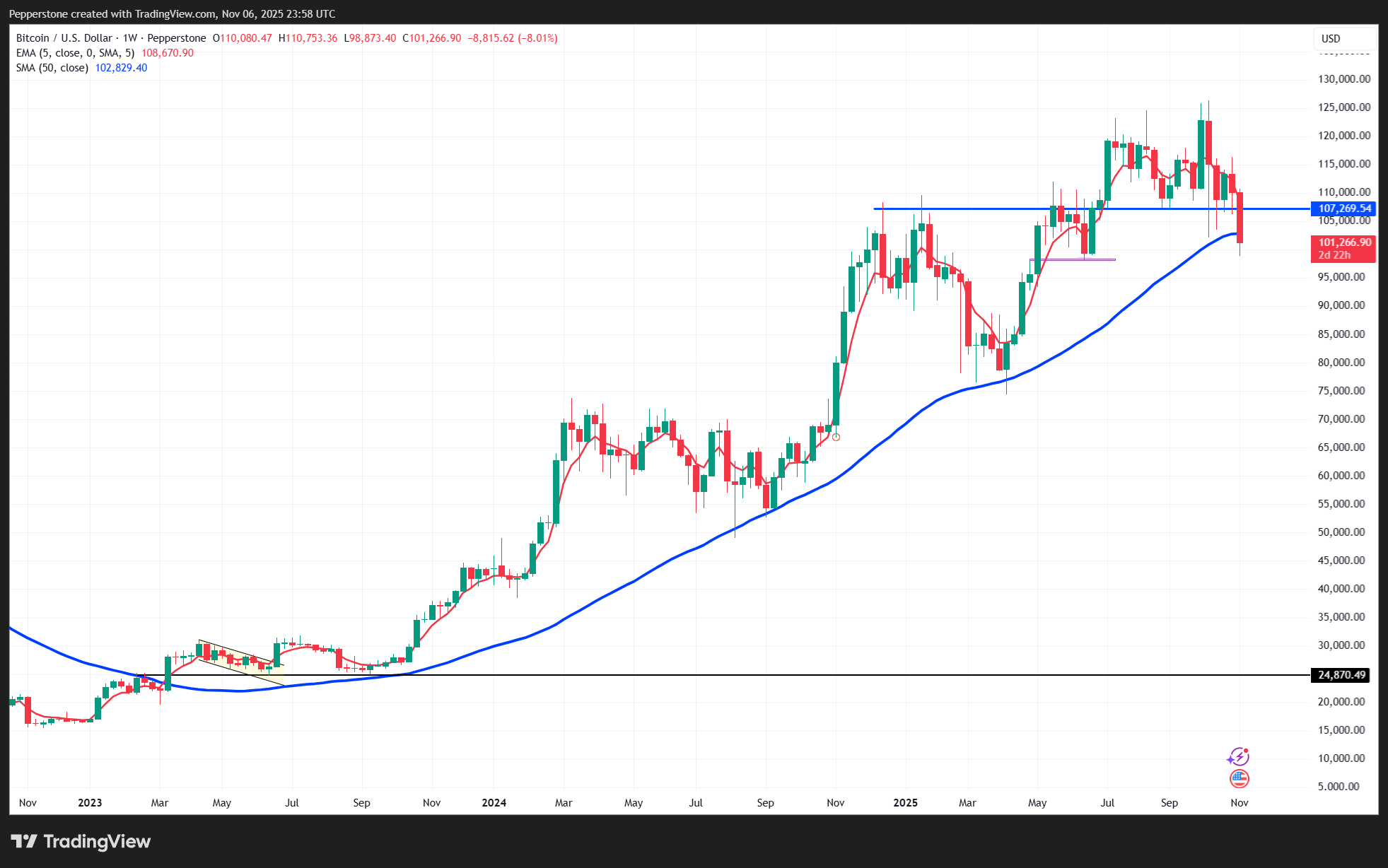 The weekly timeframe offers a clearer perspective on Bitcoin’s recent breakdown. Price action looks set to close the week below horizontal support at $107K, drawing attention to the 50-week simple moving average (SMA) - a key trend filter that has guided the uptrend since 2023.