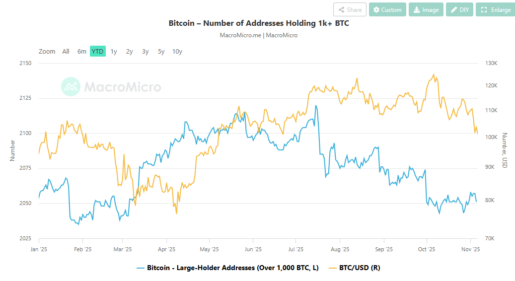 On-chain data provides additional insight into waning confidence. The number of large wallet holders — addresses holding over 1,000 BTC — has fallen from 2,117 in July to 2,057, underscoring reduced whale participation.
