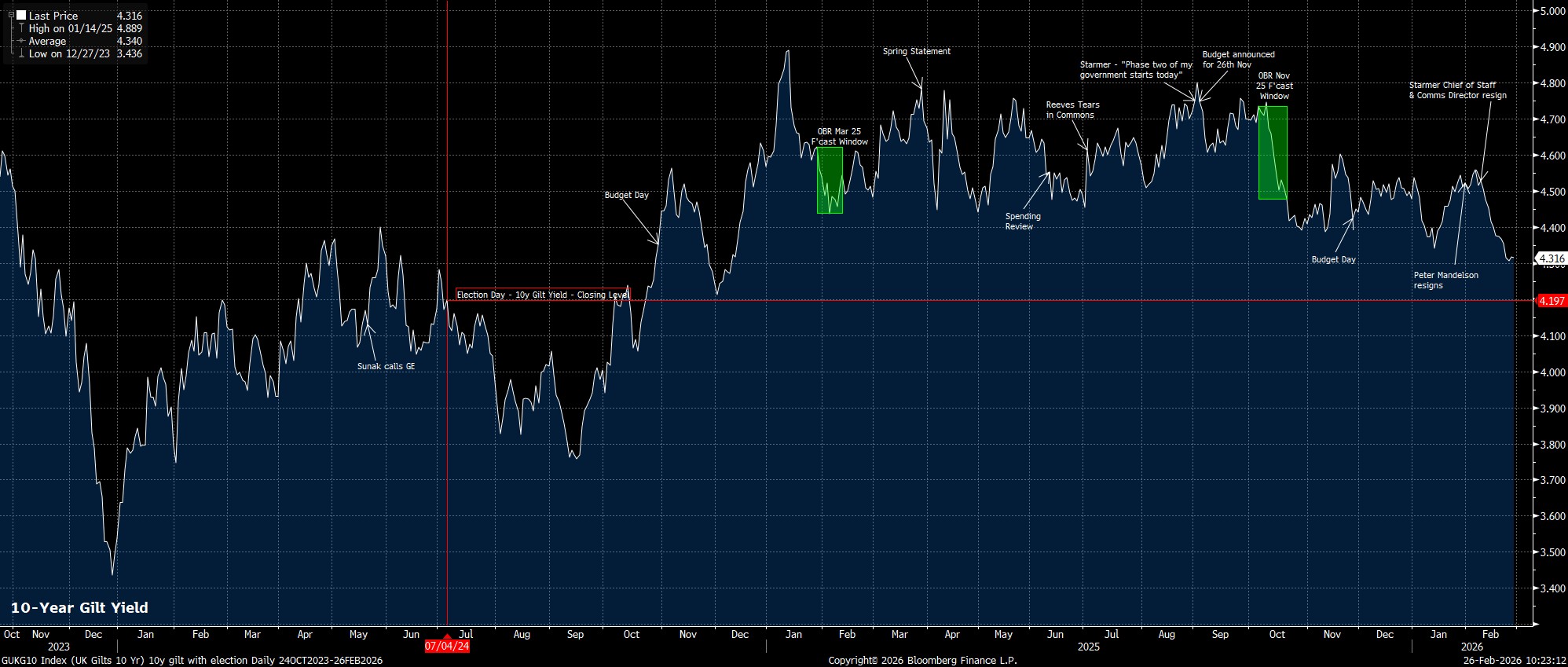 This, however, will have a relatively limited impact on the broader fiscal outlook, given that the fiscal rules are judged against the forecast for the 2029/30 fiscal year. Of considerably more importance on this front will be the recent decline seen in Gilt yields, with the benchmark 10-year having recently fallen to its lowest since December 2024. Even if the OBR shan’t issue their own estimate of the Chancellor’s headroom, it seems plausible that the 20-odd bp decline in Gilt yields since the autumn will amount to somewhere between £4-5bln in additional headroom.