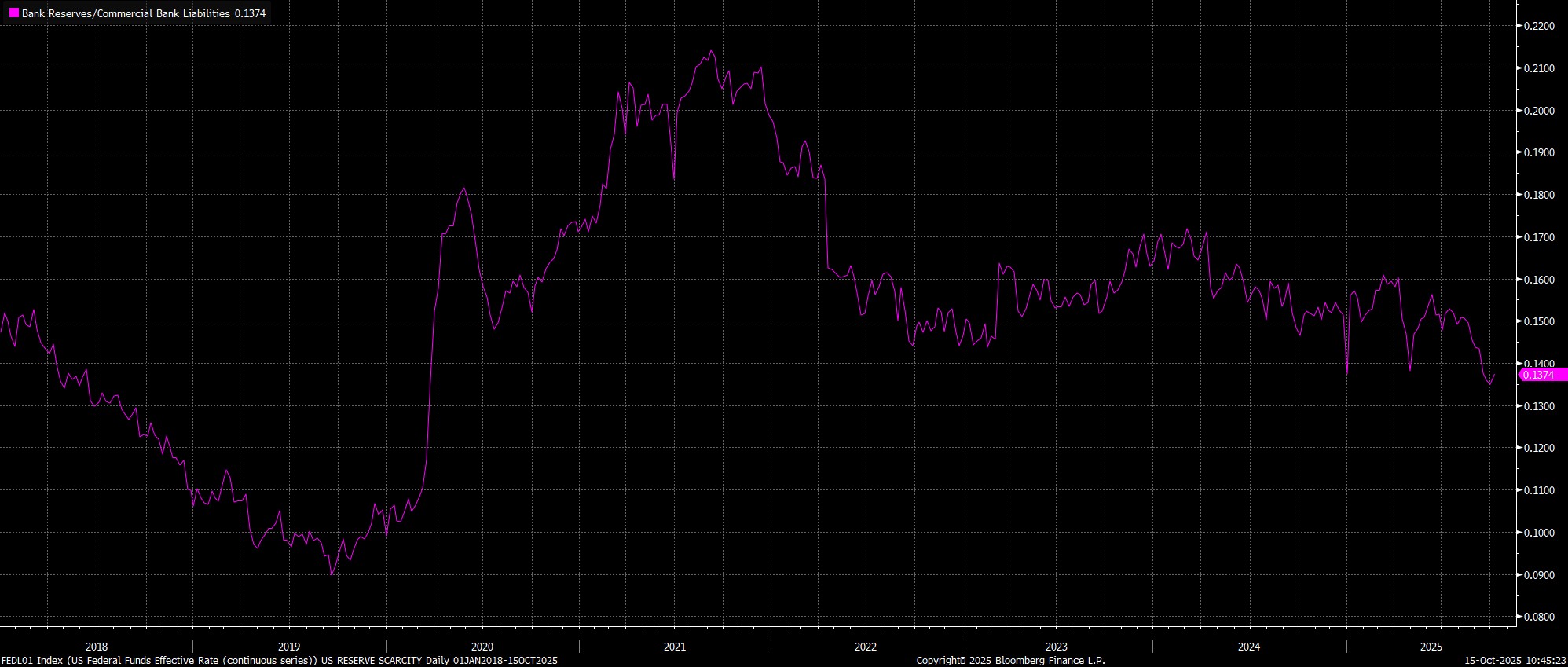 Once again, this reserve drain has proceeded relatively smoothly thus far, barring some notable pressures around quarter-ends, though again are approaching notably tight levels, with both reserves/liabilities, at under 14%, and reserves/GDP, at under 10%, at their tightest levels since prior to the pandemic.