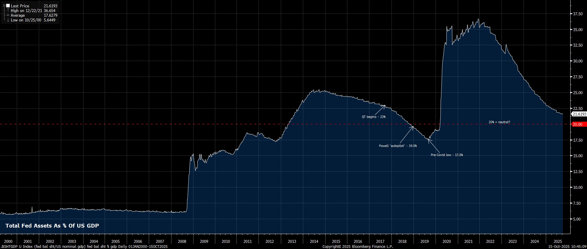 Powell’s decision to put the balance sheet in the spotlight once more makes a lot of sense as, while run-off has proceeded very smoothly indeed for the bulk of the cycle, there is now a risk that things start to become somewhat bumpier. Principally, this risk stems from the size of the balance sheet, not in nominal terms, but relative to the size of the US economy.