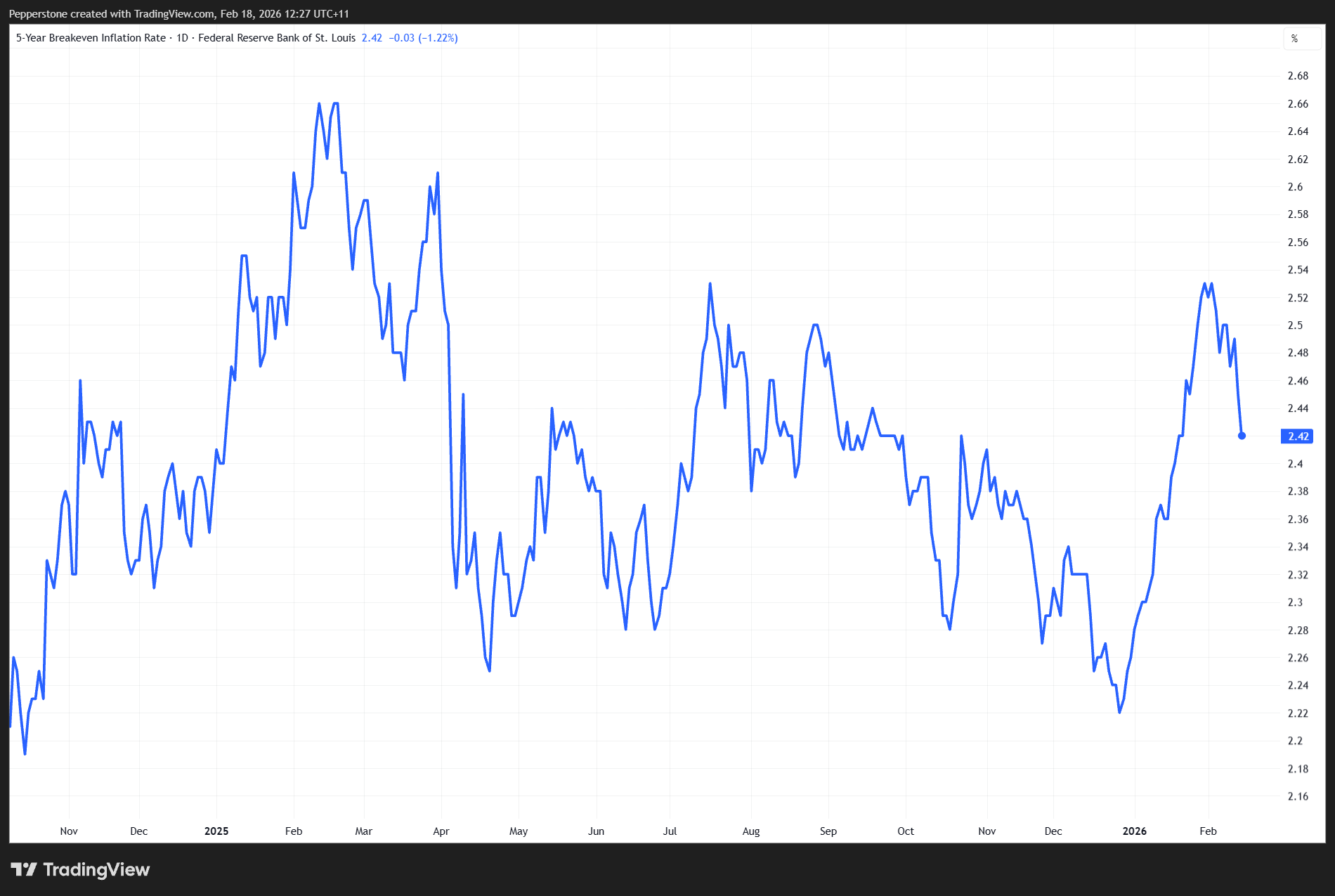 • US 5-year breakeven inflation have fallen from 2.59% to 2.42% (see chart above) - now comfortably within the Federal Reserve’s 2–3% inflation target range.