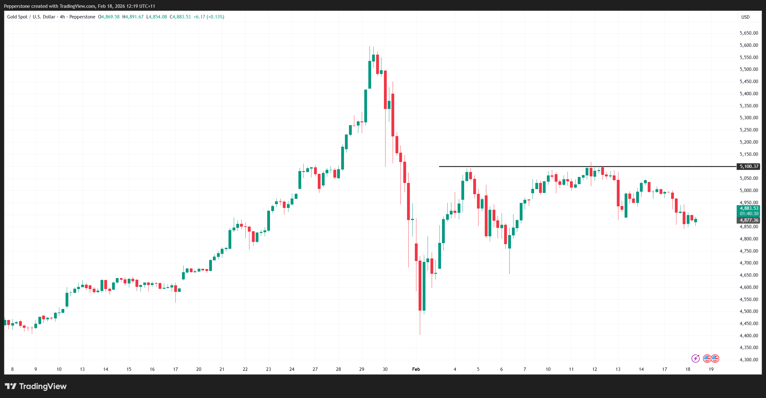 Gold’s powerful rally toward 5,600 has stalled, and the market is now consolidating below major resistance at 5,100. The debasement trade, a key pillar of the advance, appears to have been shelved for now.