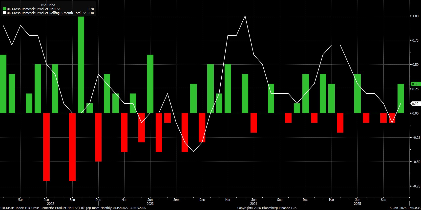 The economy expanded at a decent clip in November, by 0.3% MoM, in turn marking the first monthly expansion since all the way back in June. However, this MoM data remains volatile, and statistically noisy, meaning that a rolling 3-month average remains a cleaner way to view the underlying trend of the UK economy. On this basis, though, the economy also returned to growth, with the UK economy expanding by 0.1% in the three months to November, contrary to market expectations of an 0.2% contraction.