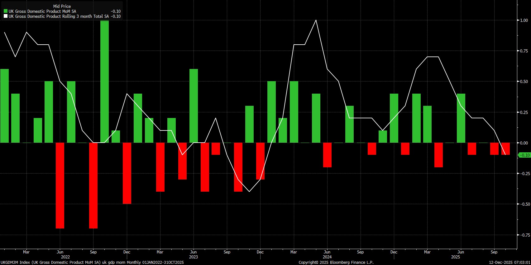 This morning's UK GDP figures pointed to the economy having unexpectedly shrunk by 0.1% MoM in October, thus marking a second straight monthly decline in overall economic output, as pre-Budget uncertainty acted as a handbrake on the economy through the autumn. Meanwhile, on a rolling 3-month basis, the economy also contracted by 0.1%, the first such contraction since the tail end of 2023.