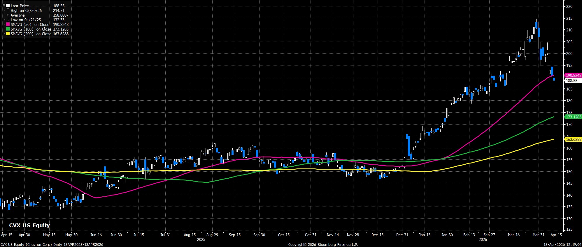 While Chevron has considerably lower exposure to the Middle East than XOM, with only around 5% of production in the region, this has not prevented the stock from also taking a lurch lower in recent sessions, with almost the entirety of the rally seen in the early days of the Middle East conflict having now been erased.