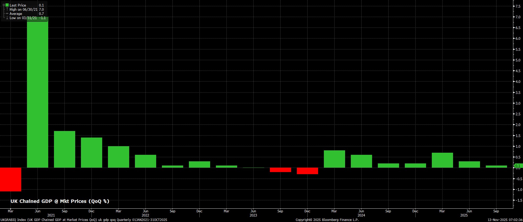In the third quarter, the economy grew by a meagre 0.1% QoQ, below both market expectations, and the BoE's forecast, of 0.2% growth, which, in turn, makes it the fourth quarter in the last five where the economy has failed to grow by more than 0.3%, with UK Plc having, for all intents and purposes, flat-lined over the last fifteen months or so.