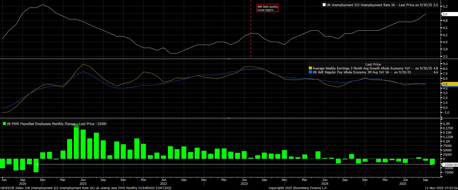 Headline unemployment rose to 5.0% in the three months to September, the highest level since February 2021, though concerns over data quality continue to plague these figures. The Bank of England, however, per the November MPR forecasts issued last week, expect unemployment to rise further in the months ahead, now expecting joblessness to peak at 5.1% in early 2026.
